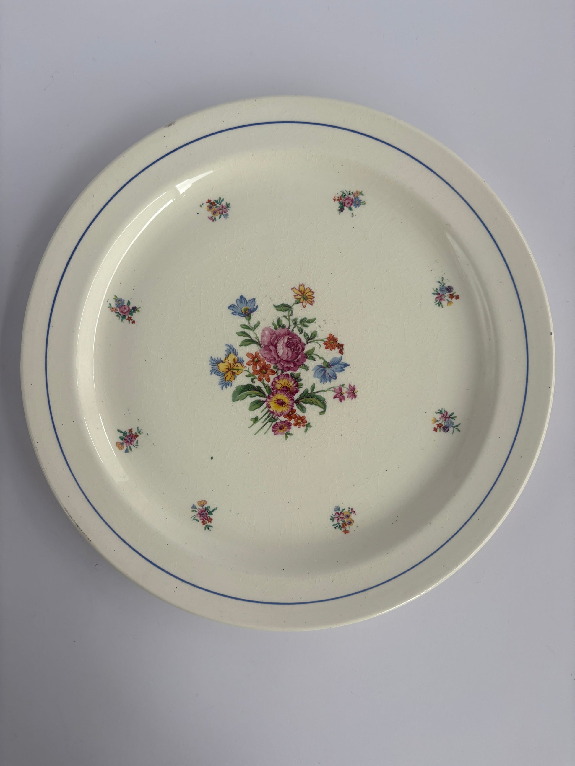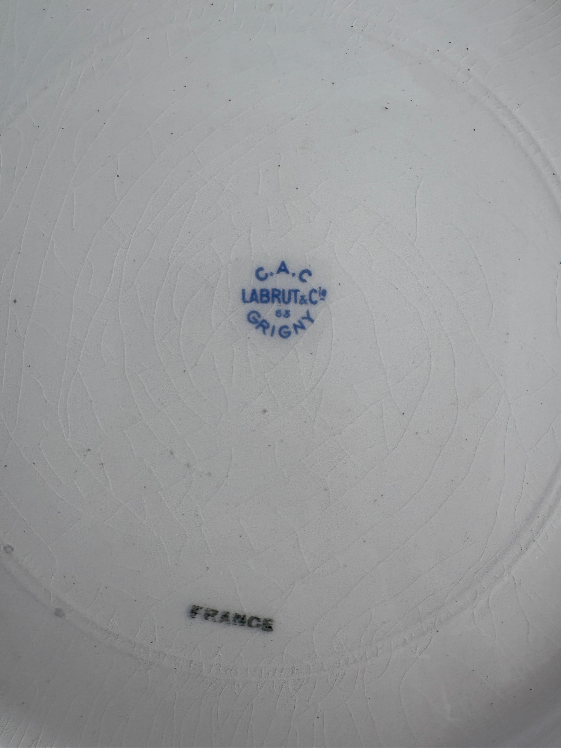 Romantic Labrut porcelain plate with floral design. Add the true brocante vibe to your table with this charming piece. Shows fine cracks in the porcelain, typical for this type of vintage plate. Ø29 cm.