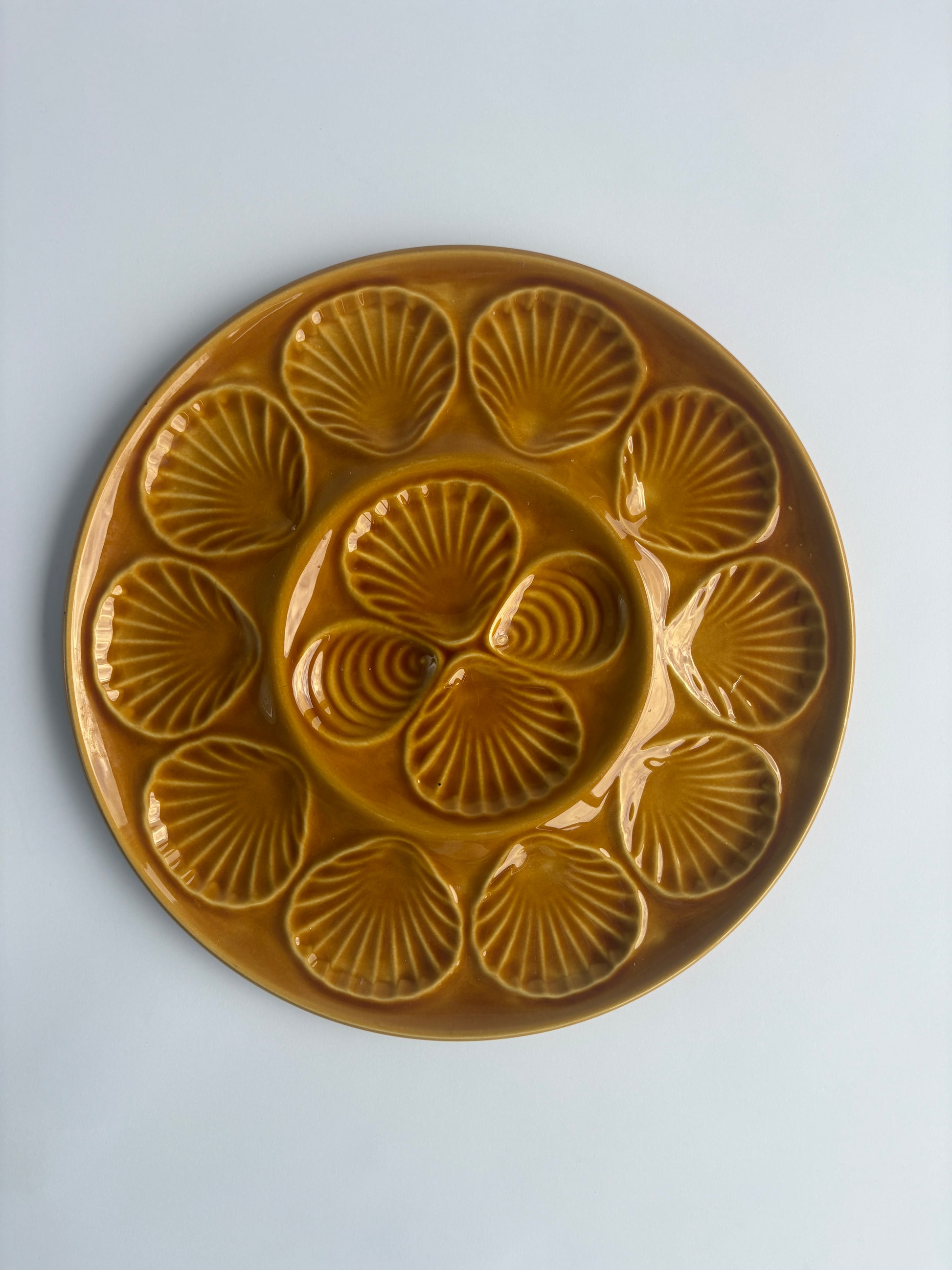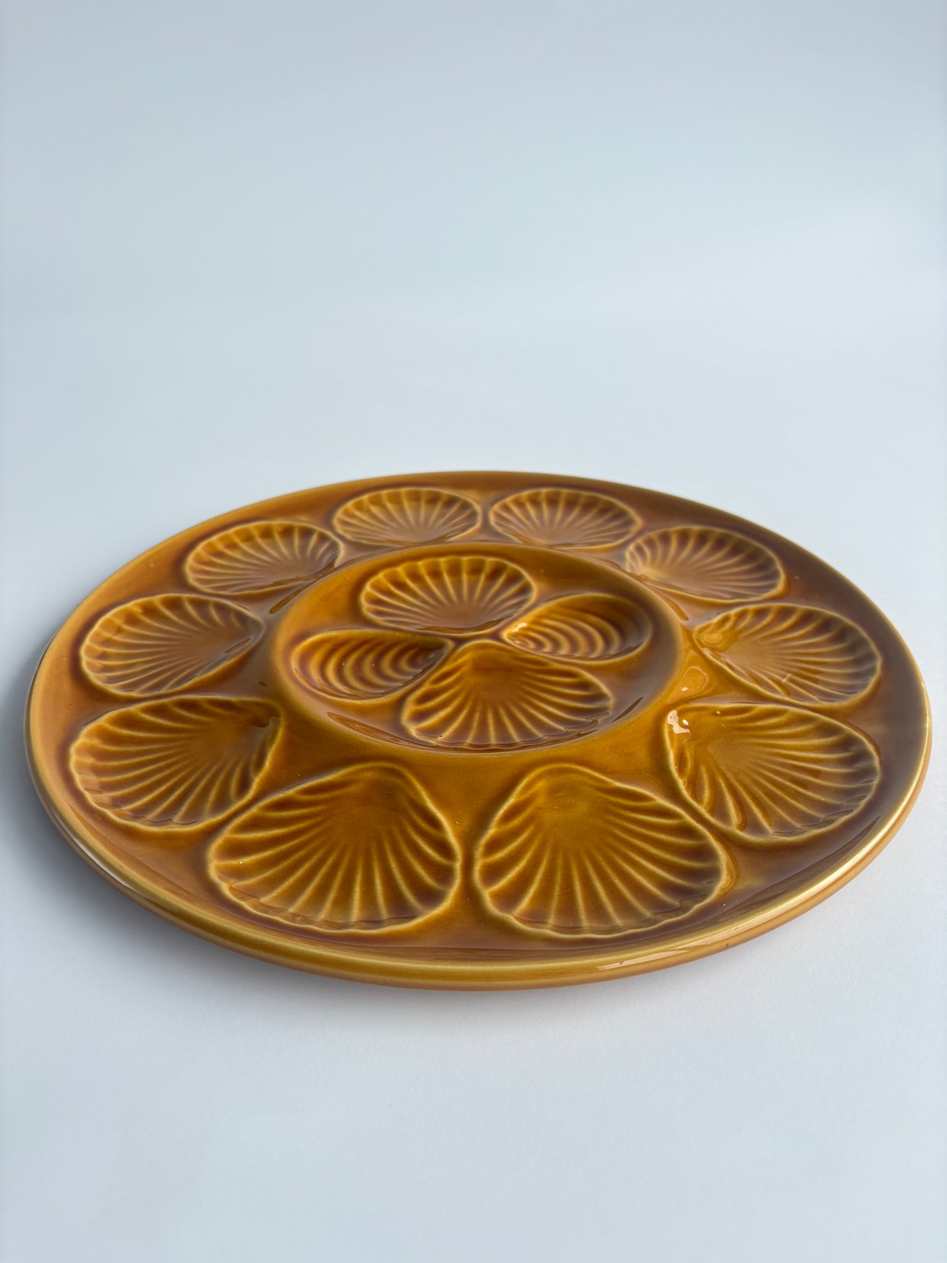 Caramel-toned oyster platter from Moulin des Loups, featuring twelve shell-shaped compartments for oysters and two small sections for lemon slices. Perfect for serving oysters in style, or as a charming snack platter with a variety of bites. Elegant, versatile, and truly a standout piece for any table. Ø: 33 cm
