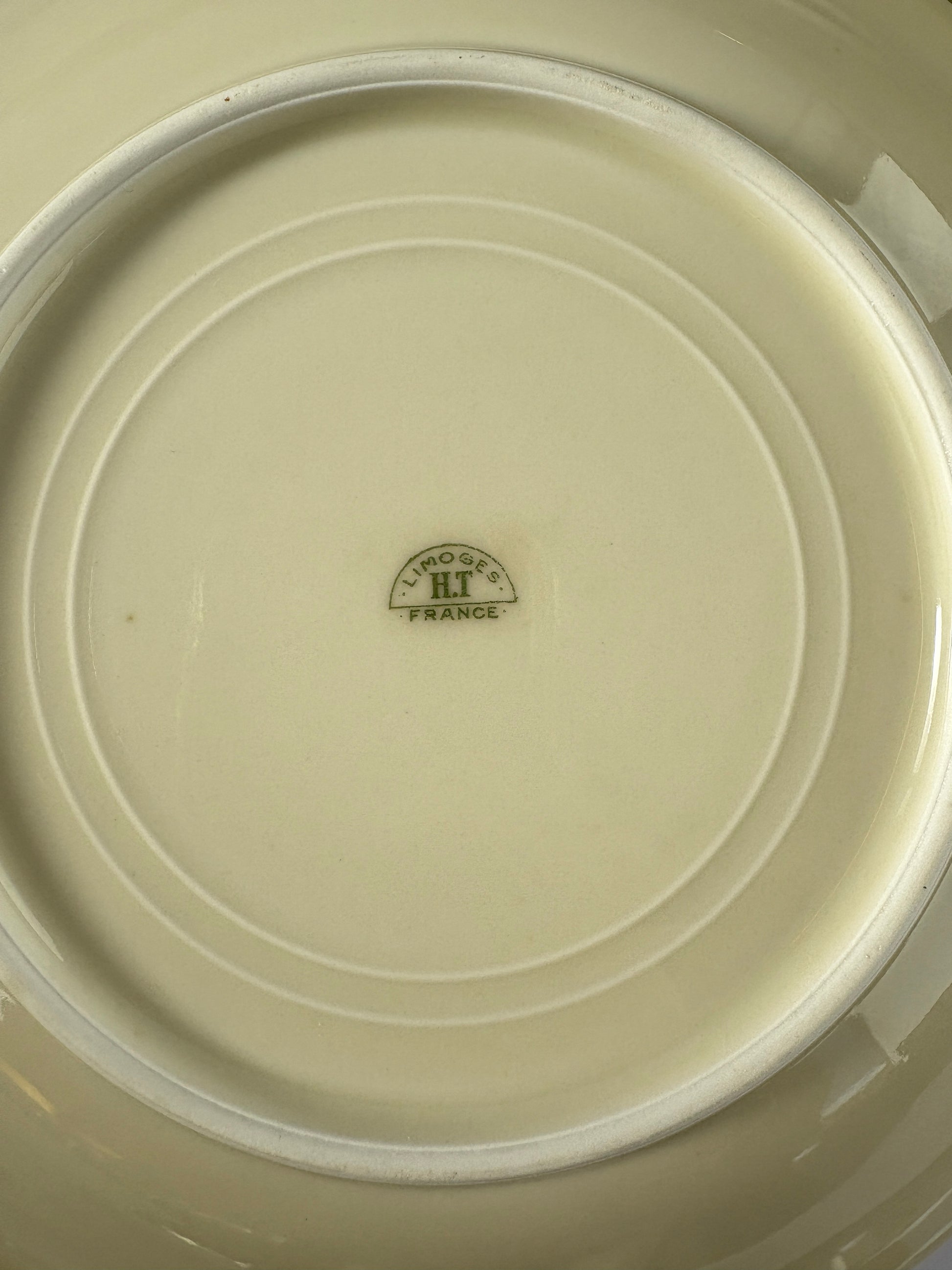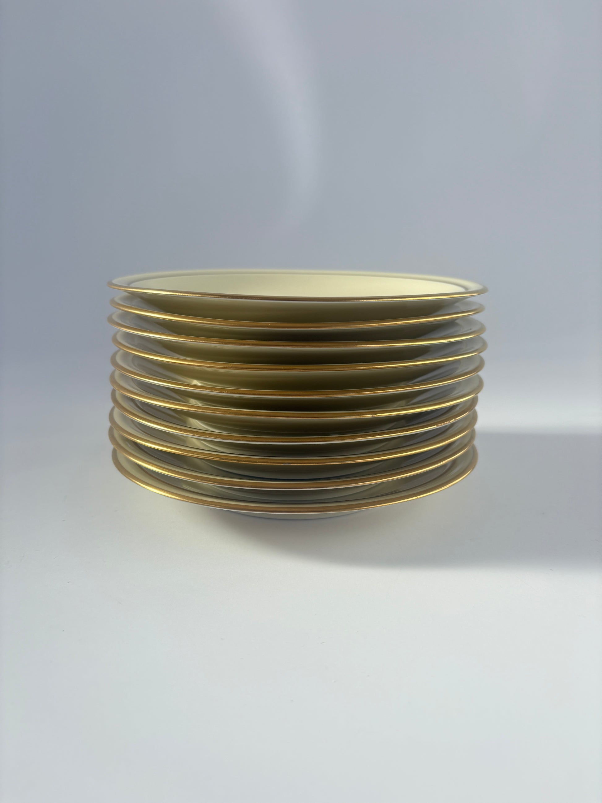 This set of 10 cream plates features a delicate double gold rim, perfect for shared dining, dinner parties, or celebration cakes. Made in the renowned Limoges region of France, each plate is in perfect condition, with the gold rims fully intact, showcasing timeless elegance and exceptional porcelain craftsmanship. Ø17 cm.