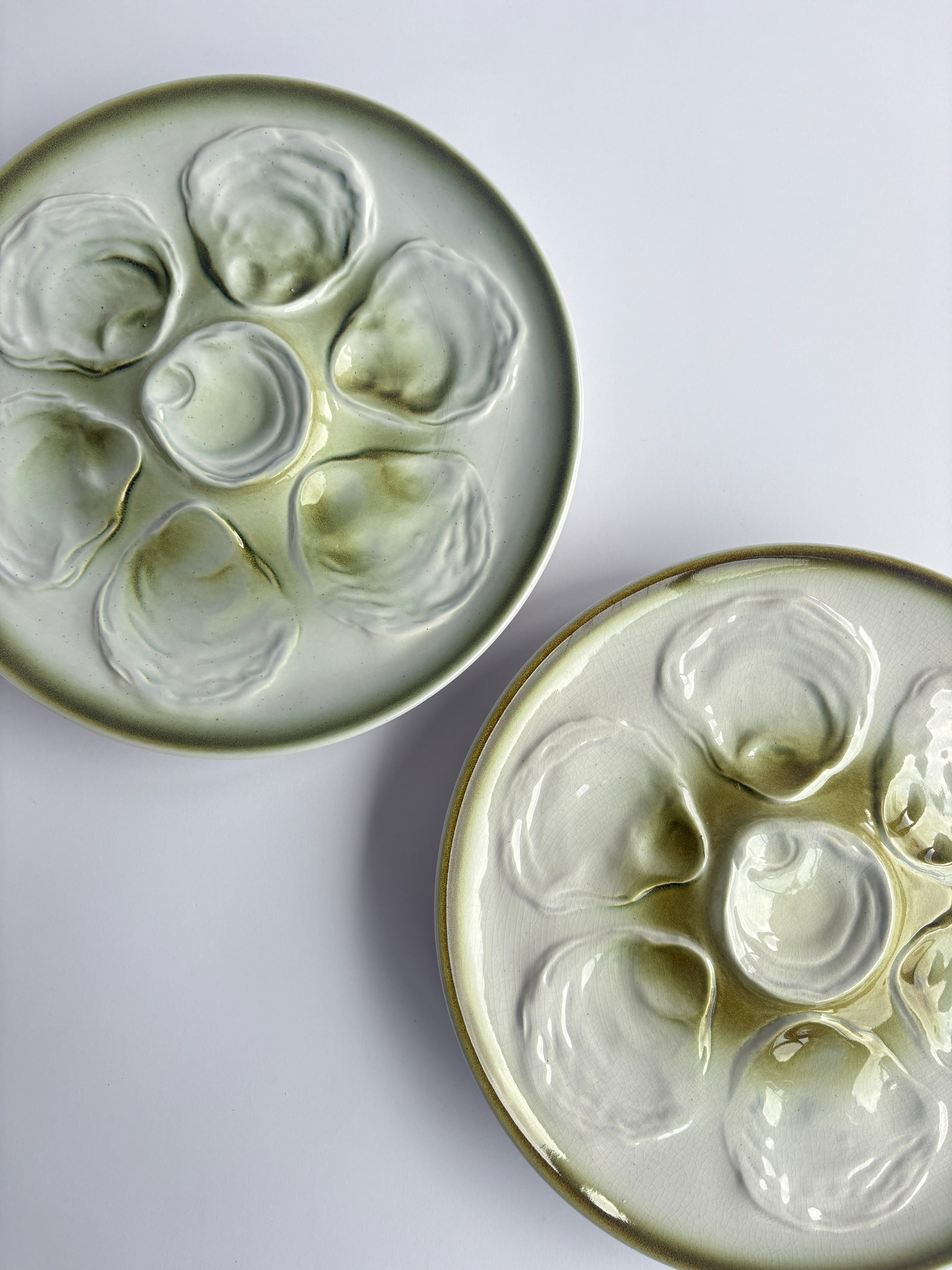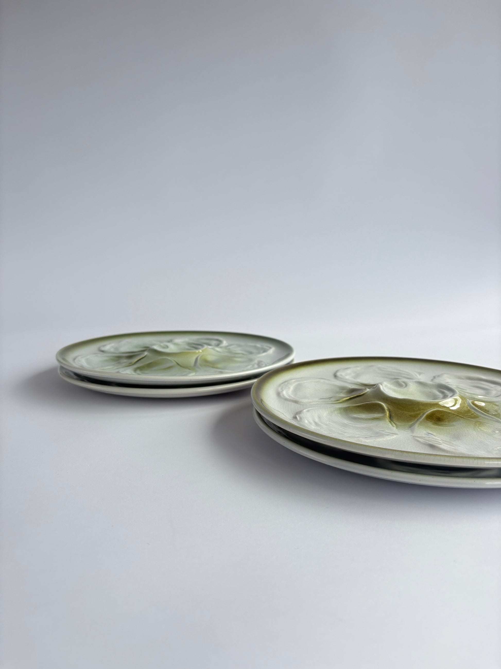 Charming oyster plates from St. Amand, France, dating back to the 1950s. Elegant white with green detailing, perfect for serving oysters in style. Sold as a set of 2, with multiple sets available. Ø: 24 cm.