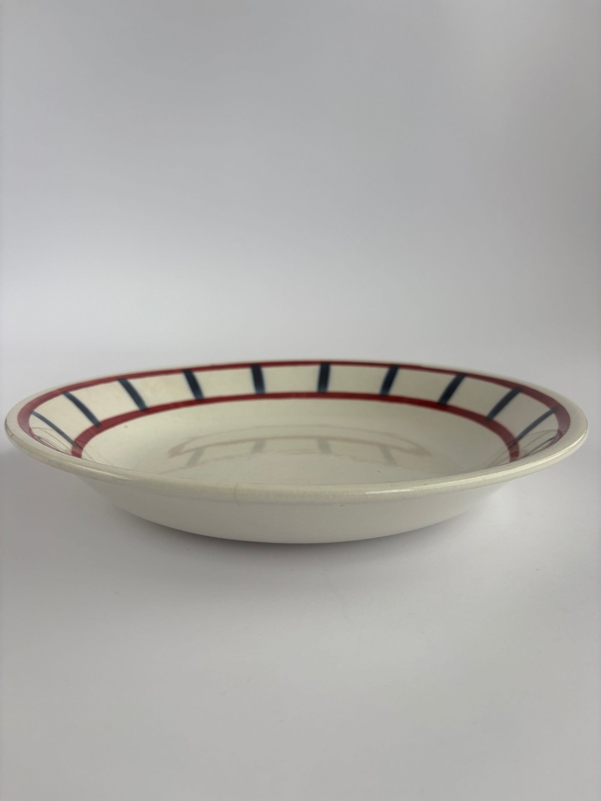 A lovely set of two serving dishes — one flat and one deep. We love the charming blue and red motif. The three large plates shown in the photo are sold separately. Ø24,5 cm and Ø28,5 x 10cm (high).