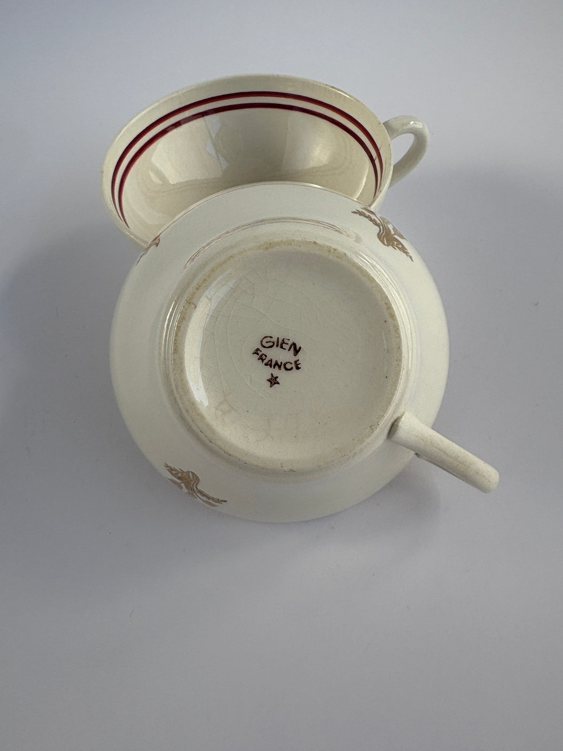 Set of two vintage Gien teacups, featuring a delicate dubble red rim on the inside and an elegant gold floral motif on the exterior. Perfect for adding a touch of timeless French elegance to your tea ritual.