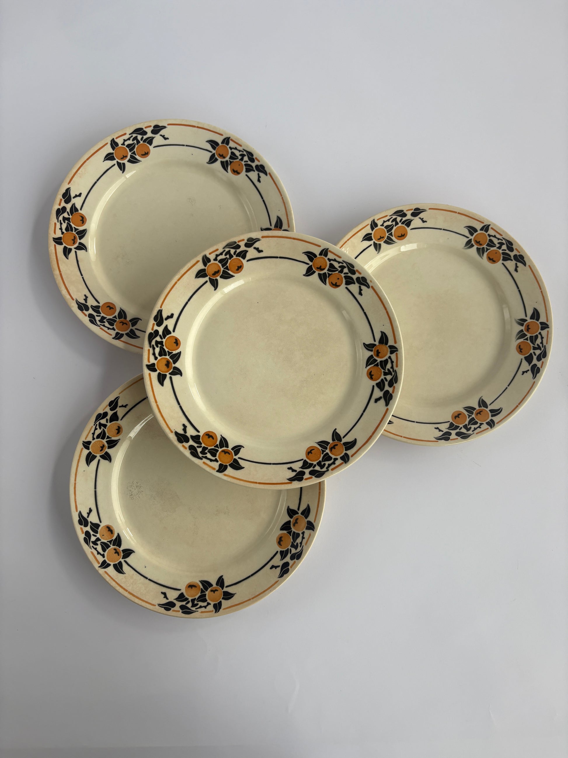 Set of 4 vintage Badonviller plates from the Madeleine collection, dating from 1900–1905. Charming signs of age (craquelure) add to their character. We simply adore this orange motif design — simple, yet oh so cheerful. Diameter is 23.5 cm.