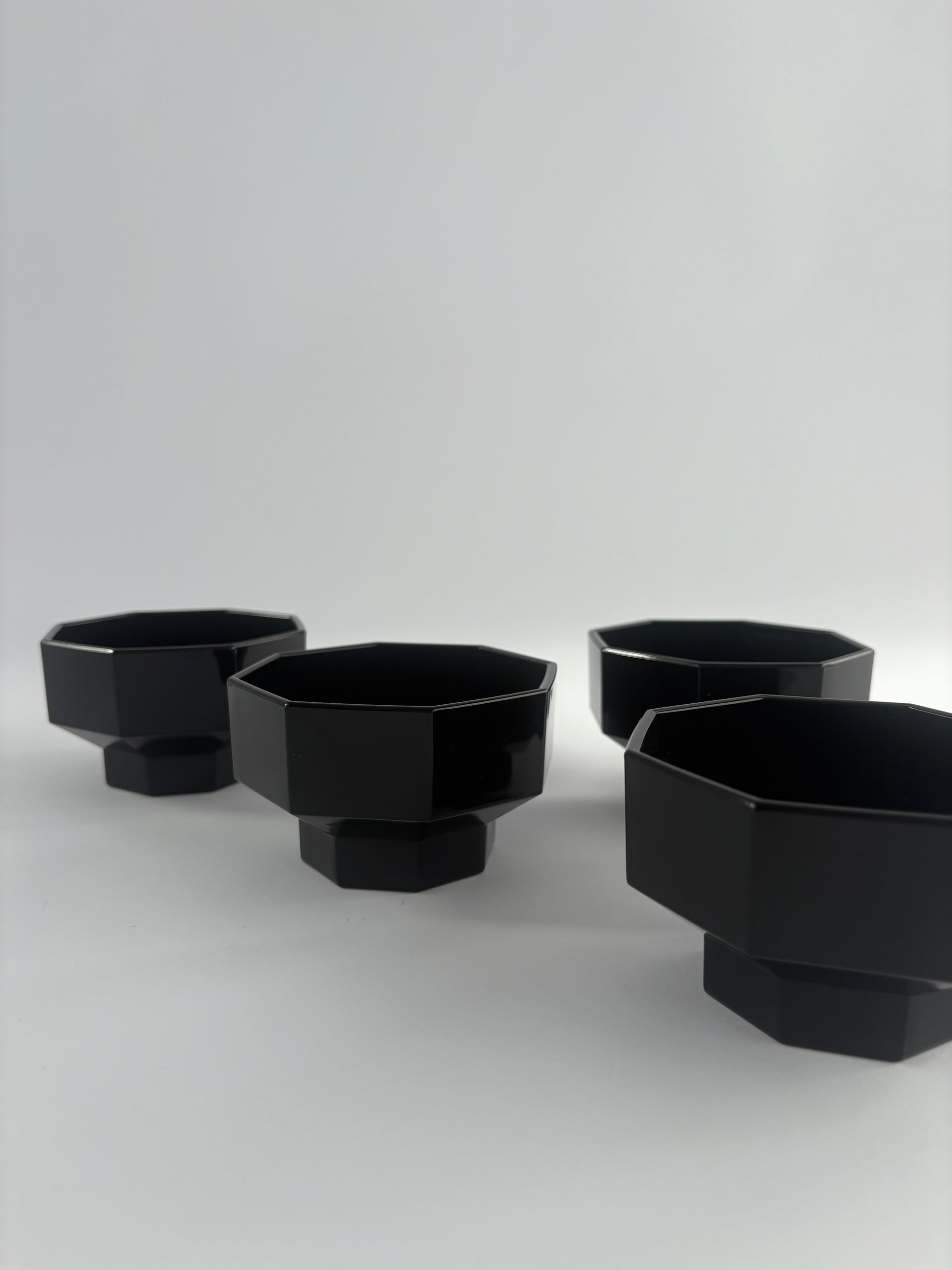 A set of four black tempered glass coupes by Arcoroc Octime. While silver coupes are all the trend, these retro black coupes dare to stand out — perfect for snacks or desserts. A true style icon from the 1980s with a striking octagonal design. Stackable. Two sets available.