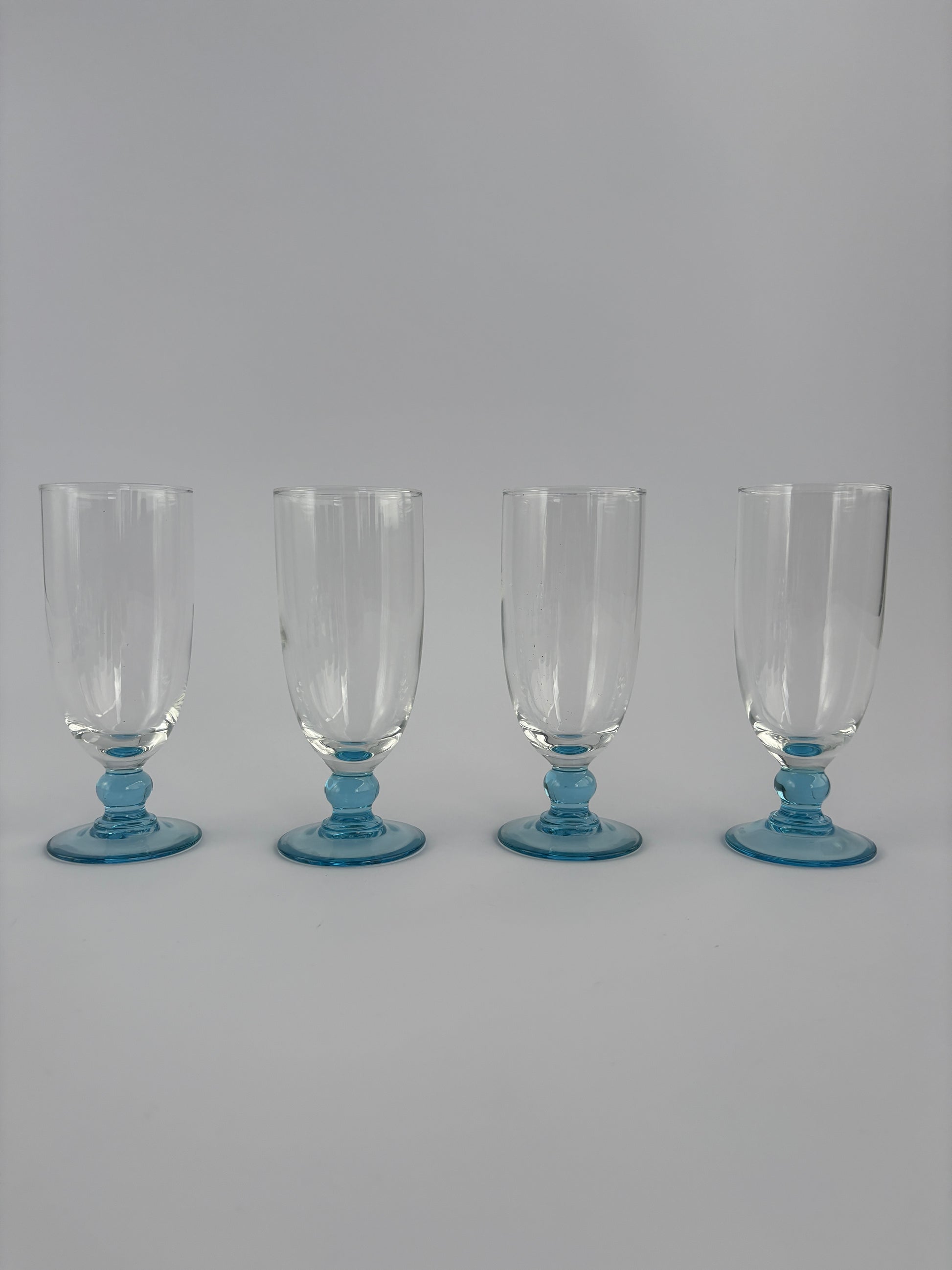 Set of 4 charming champagne glasses with light blue stems, marked Arc France on the base. Perfect for a sparkling natural wine like pet nat in red — imagine how festive that would look!