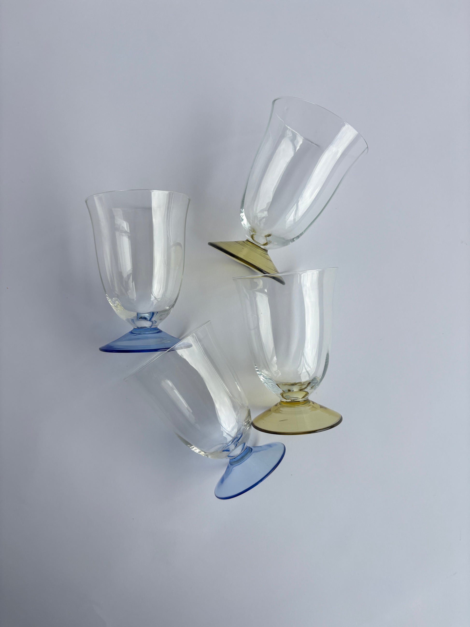 Set of 4 delicate goblets, featuring 2 with blue stems and 2 with yellow-ish stems. The thin glass gives them an elegant look and a pleasant drinking experience. Perfect for serving water in style, adding a subtle pop of color to the table.