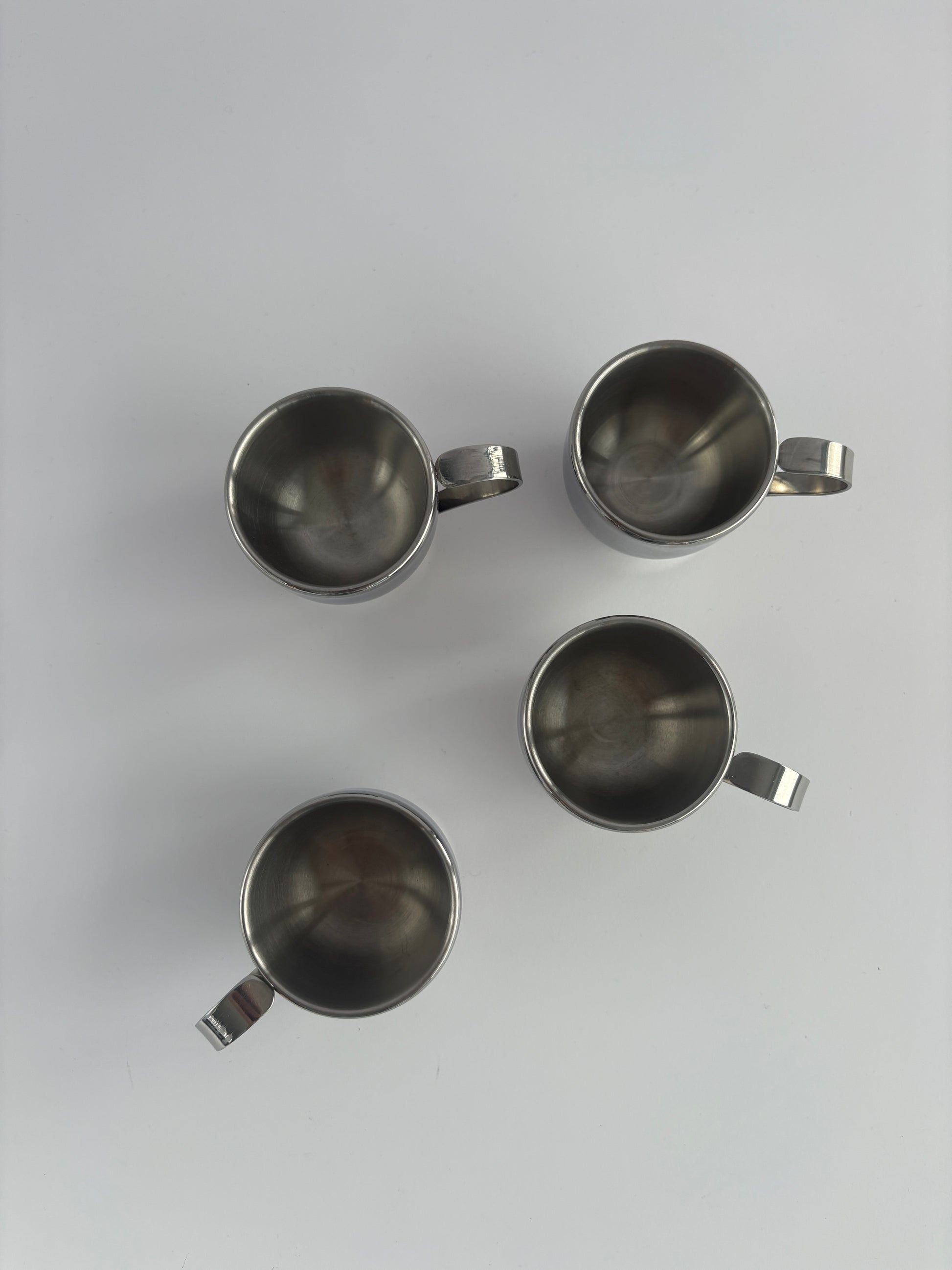 Set of 4 double-walled stainless steel espresso cups. Keep your espresso hot while the exterior stays cool to the touch. Sleek, modern, and perfect for everyday use.