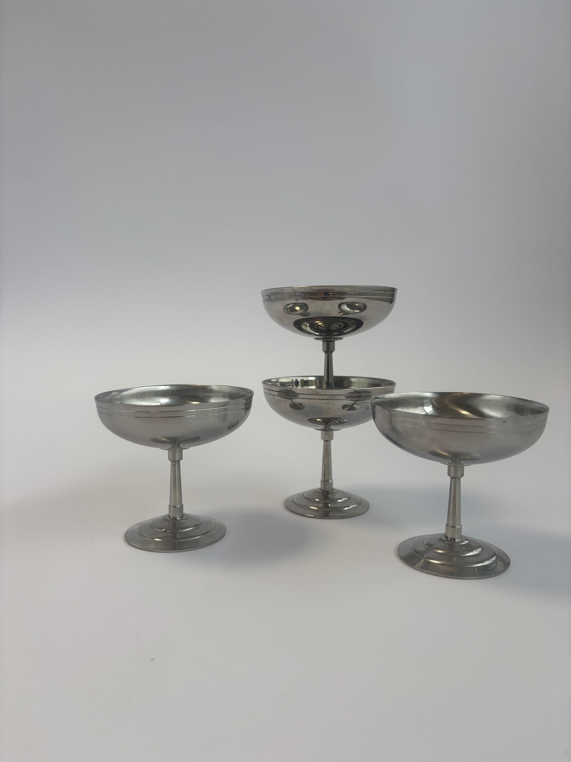 Set the tone for elegance with these four silver pedestal coupes. Tall three-step base and double-ring rim detail make them perfect for champagne or cocktails. Timeless and refined. Multiple sets available.