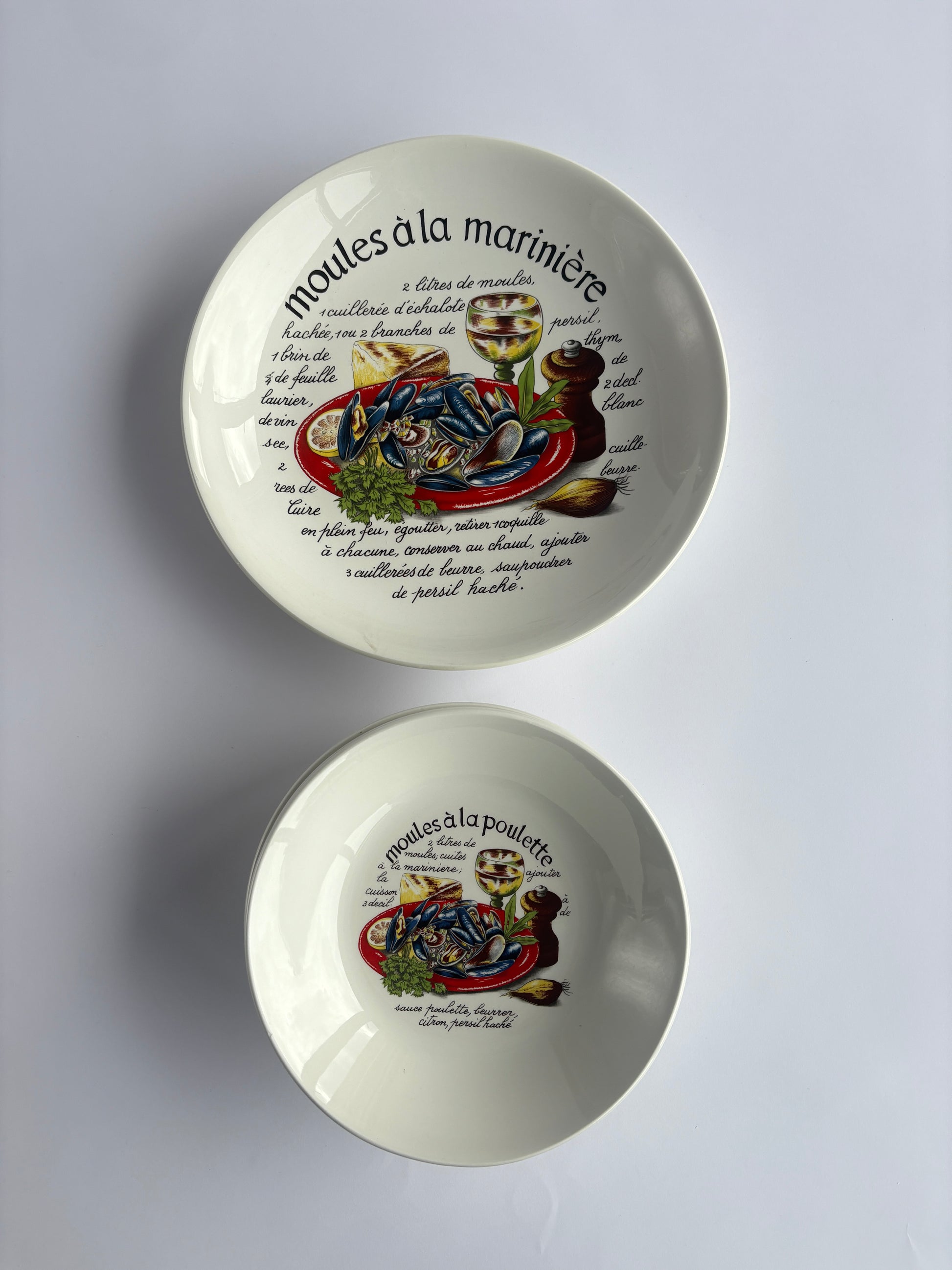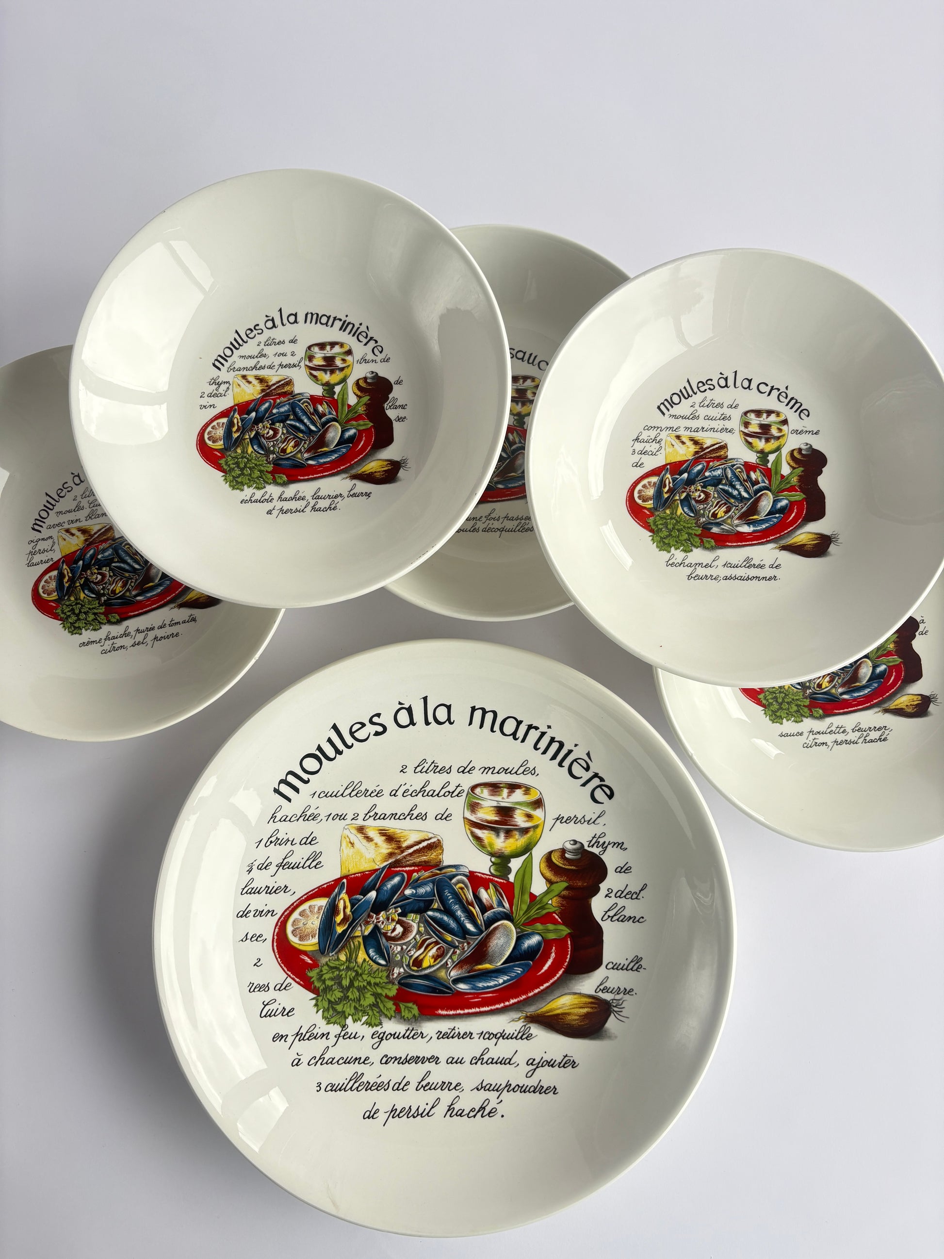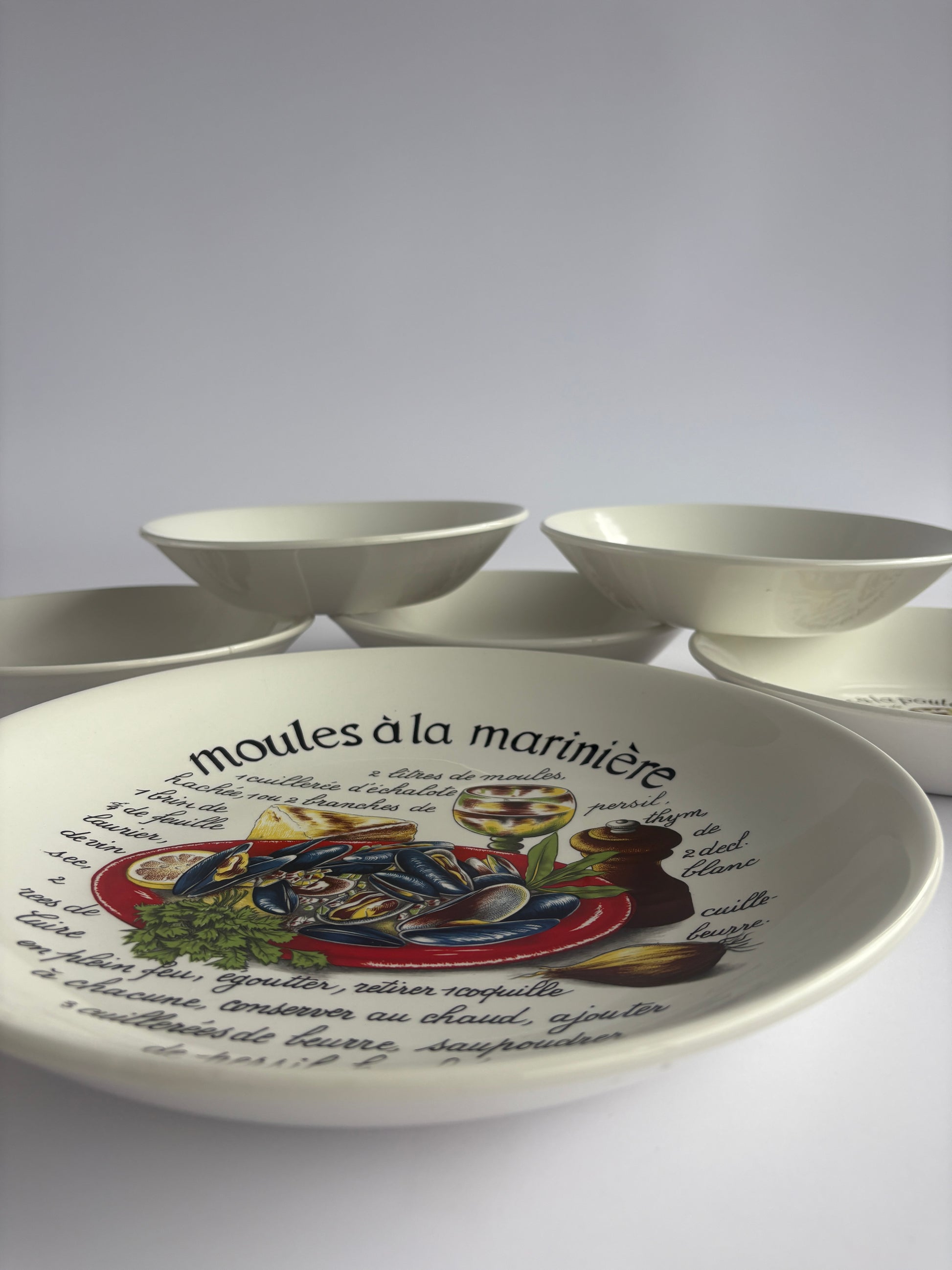 A unique set featuring 5 deep mussel plates and a large matching serving plate. Each plate comes with its own mussel recipe, making this set perfect for entertaining or enjoying a variety of seafood dishes in style.