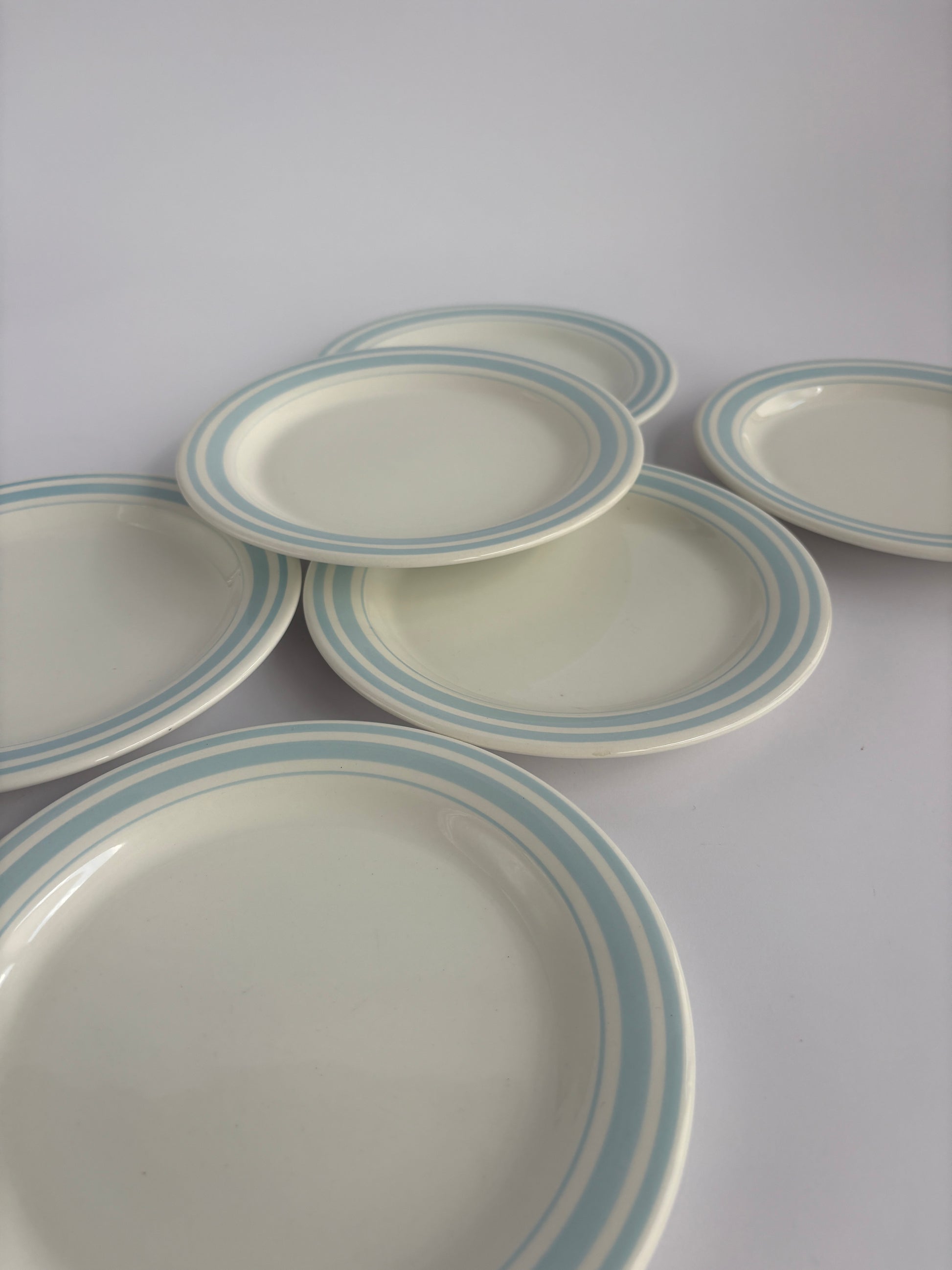 Set of 6 white plates with a triple light-blue rim, vinatge made in Italy by Quadrifoglio. How fun is a Sunday breakfast with these plates? They practically ask for the perfect croissant to start your day, bringing a touch of Italian charm to every meal. Ø20 cm.