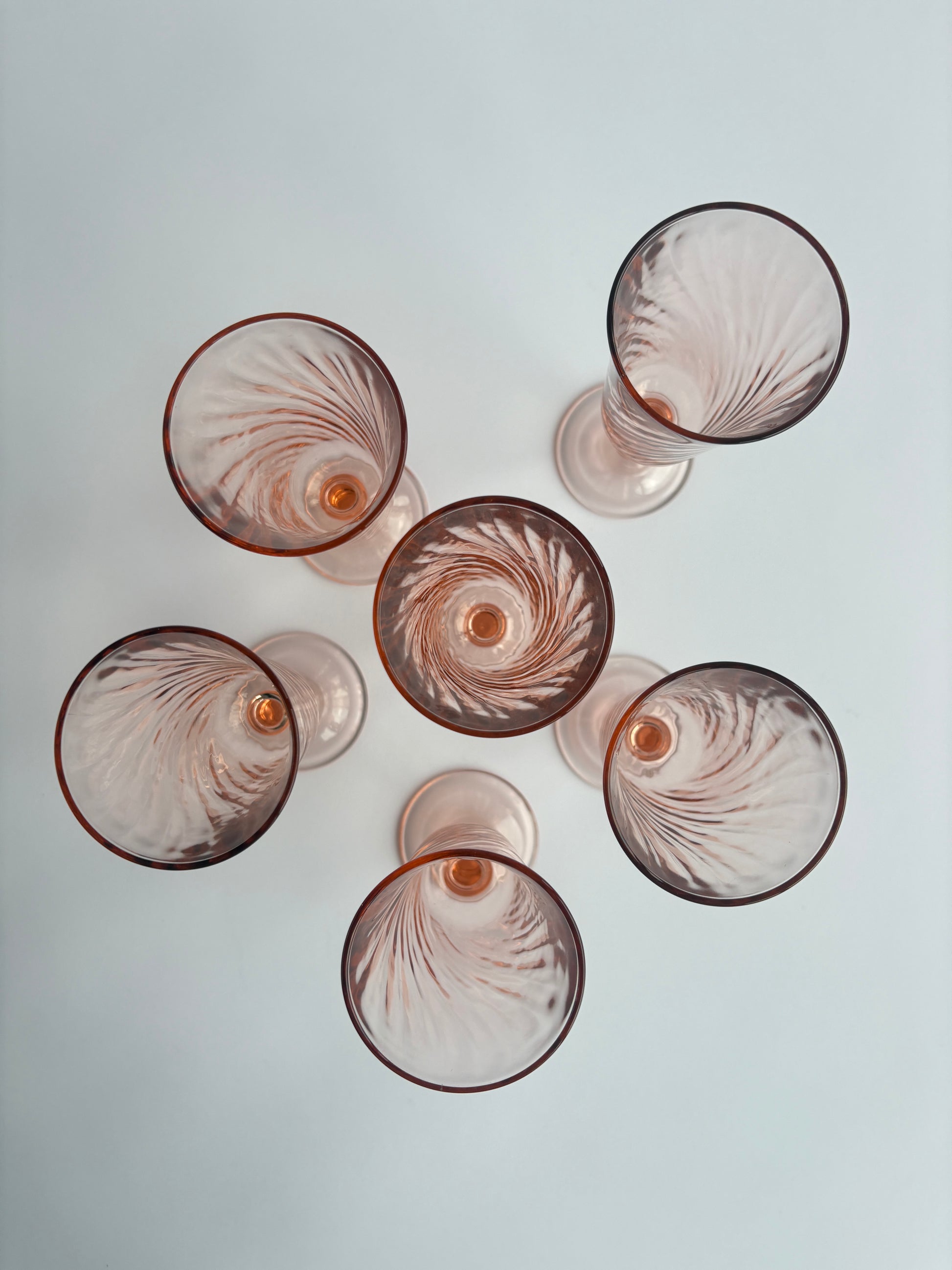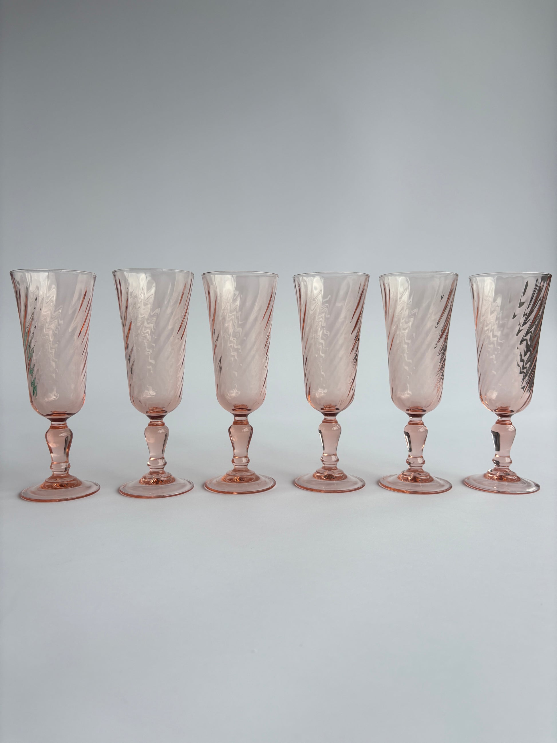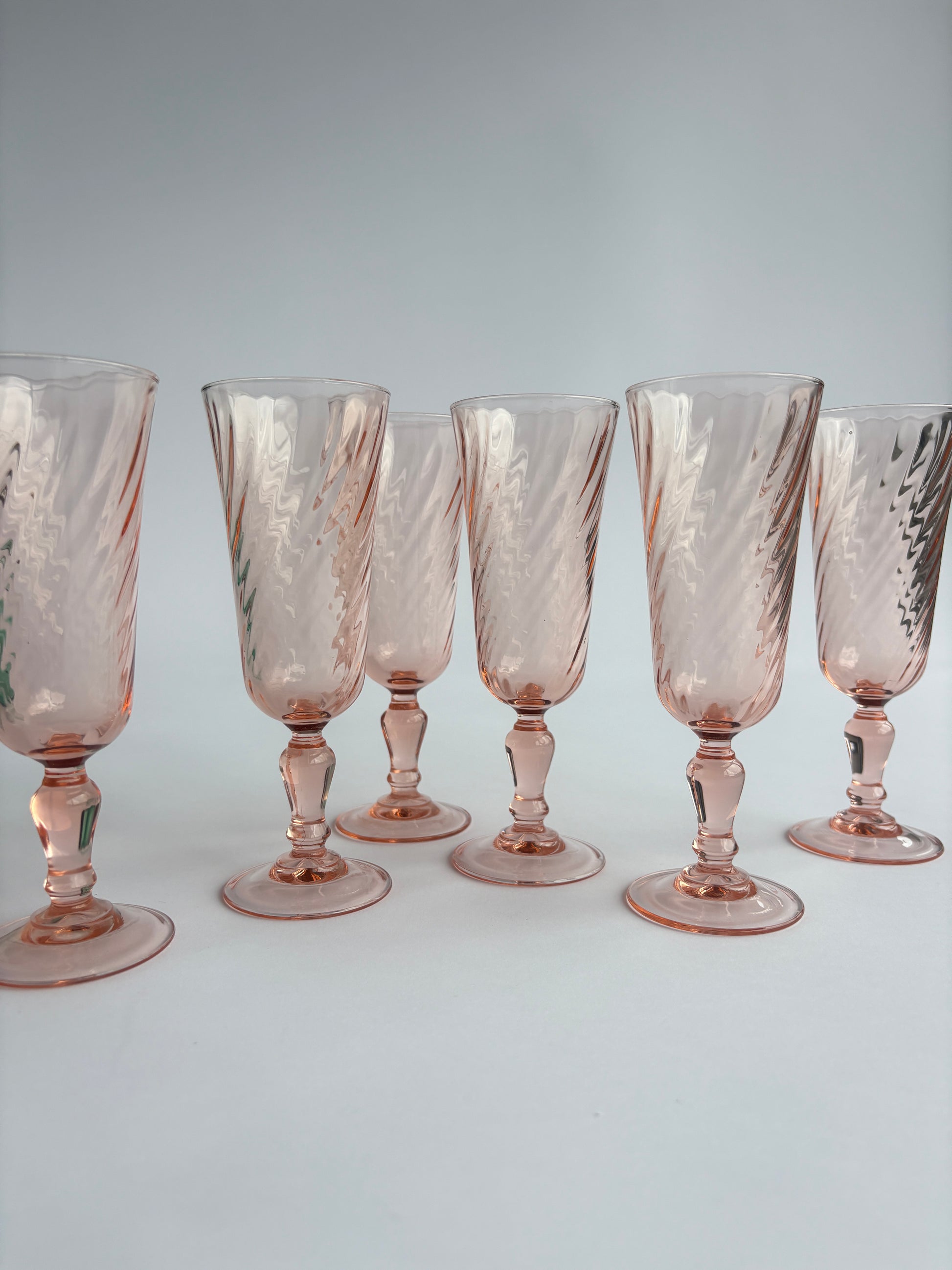 Retro French elegance in soft pink. These vintage Luminarc Rosaline champagne coupes from the 1960s–1980s feature a delicate swirl at the top, adding depth and character. Perfect for serving champagne or sparkling wine with a subtle, stylish pop of color.